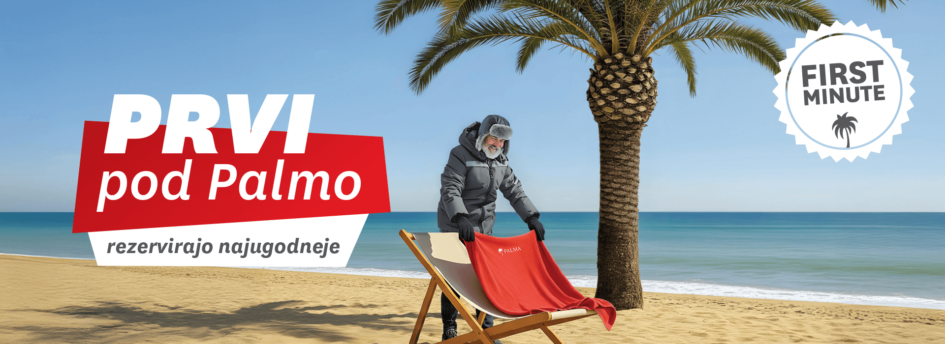 Ujemite največji FIRST MINUTE popust za dopust do 31. januarja. Za vas smo skrbno preverili in izbrali hotele, apartmaje in družinske penzione na najlepših destinacijah Mediterana, Egipta in Jadrana. Zagotovite si svoj poletni oddih, ko so cene počitnic najnižje in je izbire največ. Za vsak stil preživljanja počitnic, za vsako generacijo in vsak žep imamo pod Palmo pravo ponudbo.